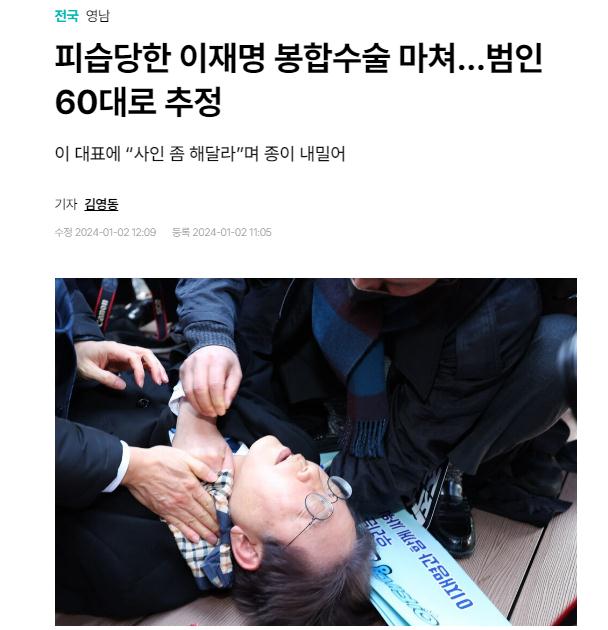 中新網(wǎng)1月2日電 綜合韓媒報(bào)道,當(dāng)?shù)貢r間2日,韓國最大在野黨共同民主黨黨首李在明在釜山遇襲后,接受了縫合手術(shù)。