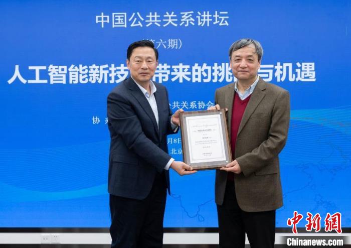 1月8日,中國(guó)公共關(guān)系講壇在北京舉行。圖為講壇結(jié)束后,中國(guó)公共關(guān)系協(xié)會(huì)會(huì)長(zhǎng)郭衛(wèi)民(左)向演講嘉賓、清華大學(xué)人工智能研究院常務(wù)副院長(zhǎng)孫茂松頒發(fā)榮譽(yù)證書(shū)。 中國(guó)公共關(guān)系協(xié)會(huì)供圖。