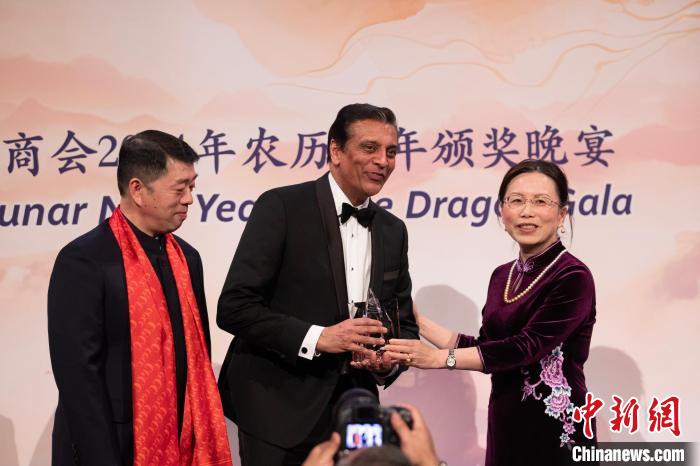 當(dāng)?shù)貢r(shí)間1月18日,美國(guó)中國(guó)總商會(huì)(CGCC)在紐約舉行2024年農(nóng)歷龍年頒獎(jiǎng)晚宴。圖為中國(guó)駐美國(guó)大使館公使徐學(xué)淵(右)為聯(lián)邦快遞總裁兼首席執(zhí)行官拉杰·蘇巴馬廉(中)頒發(fā)“國(guó)際領(lǐng)導(dǎo)力獎(jiǎng)”。 中新社記者 廖攀 攝