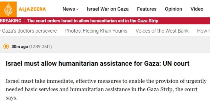 卡塔爾半島電視臺稱,國際法院責成以色列采取更多措施保護巴勒斯坦人,但沒有命令其結束在加沙地帶的軍事行動。此外,國際法院要求以色列在一個月內(nèi)就其已采取的行動向國際法院提交報告。