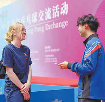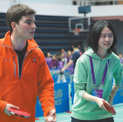 弗吉尼亞大學(xué)學(xué)生米莎與清華大學(xué)學(xué)生曾加寶組成搭檔。在練習(xí)環(huán)節(jié)中,對手朝著米莎的方向打來一記高難度弧圈球,米莎一時間有些不知所措,只聽曾加寶喊了一句“我來”,便眼疾手快地沖了過去,擋在米莎前面,接住了這個球。這有趣又溫馨的一幕,引來了現(xiàn)場觀眾的掌聲,也瞬間拉近了兩個年輕人的距離。“我的搭檔一直鼓勵我,耐心地指導(dǎo)我握拍、擊球。我們一起討論乒乓球和學(xué)業(yè),現(xiàn)在已經(jīng)成了朋友?!泵咨f。