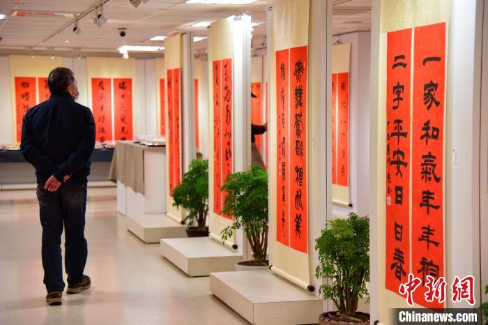 1月28日,兩岸藝術家春聯(lián)展在臺北江山如此多嬌藝術館舉行,32位臺灣藝術家、13位大陸藝術家的90多幅作品參展。圖為現(xiàn)場展出的春聯(lián)作品。中新網(wǎng)記者 路梅 攝