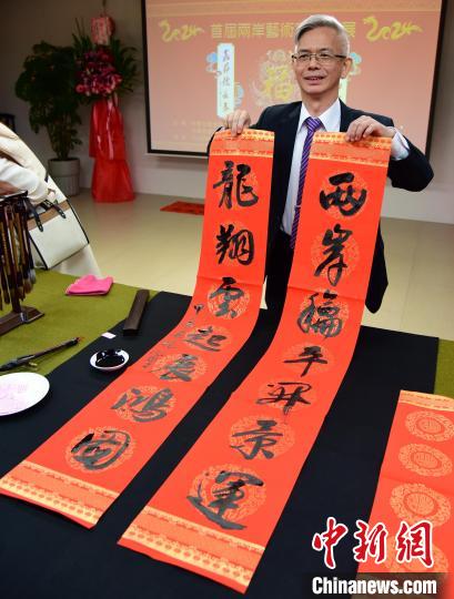 1月28日,兩岸藝術家春聯(lián)展在臺北江山如此多嬌藝術館舉行。圖為臺灣中華書道學會理事長楊旭堂當場揮毫書寫“兩岸和平開景運,龍翔云起展鴻圖”。中新網(wǎng)記者 路梅 攝