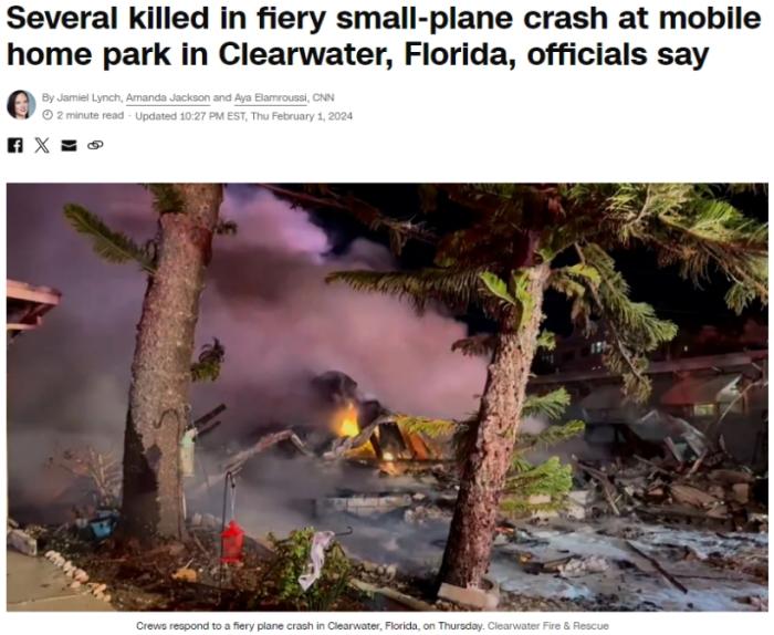 當(dāng)?shù)貢r間2月1日,美國佛州一架小型飛機(jī)墜毀。圖片來源:美國有線電視新聞網(wǎng)(CNN)報道截圖