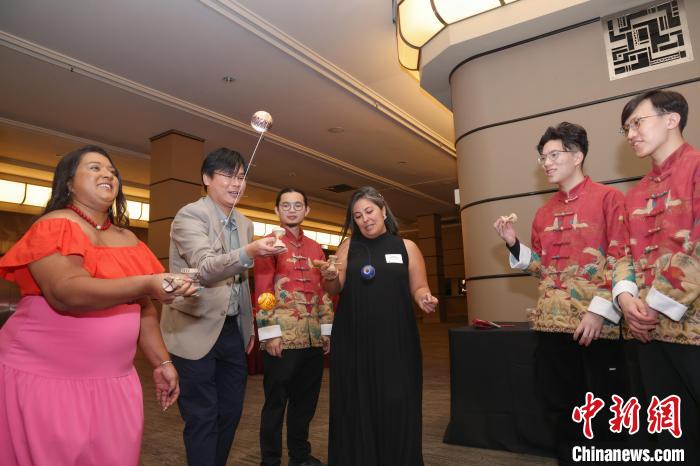 2月8日,曾在香港和國際賽事中屢獲殊榮的香港劍球(亦稱劍玉)隊成員(著唐裝者)獲香港駐多倫多經(jīng)貿(mào)處邀請訪加并出席新春酒會時,指導(dǎo)與會嘉賓體驗(yàn)劍球?!≈行律缬浾?余瑞冬 攝