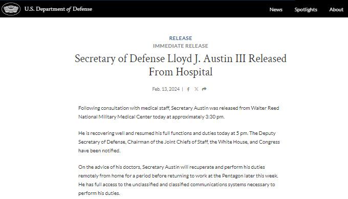 聲明稱,經(jīng)過與醫(yī)務人員協(xié)商后,奧斯汀于13日下午3時30分左右出院。他恢復良好,并于當日下午5時恢復了全部職能和職責。