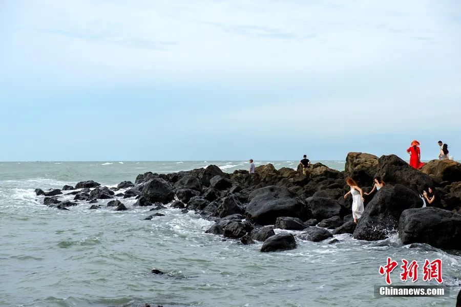 游客在儋州峨蔓火山海岸龍門激浪景觀點(diǎn)游玩。凌楠 攝