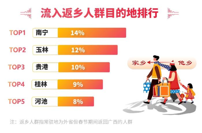 春節(jié)期間,廣西迎來客流高峰。據(jù)統(tǒng)計,廣西流入客流同比增長7%,流出客流同比增長18%,凈增客流超過1000萬人。其中,返桂人潮占比25%,男性成為返鄉(xiāng)主力,占比58%?!?0后”和“90后”人群成為返鄉(xiāng)主流,占比超過50%。交通出行方面,短途游備受青睞,200-500公里出行占比達(dá)到48%,汽車成為首選出行方式。