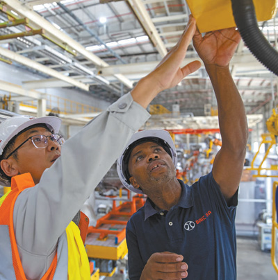 中國和南非兩國員工在南非東開普省北汽南非工廠焊裝車間內工作。