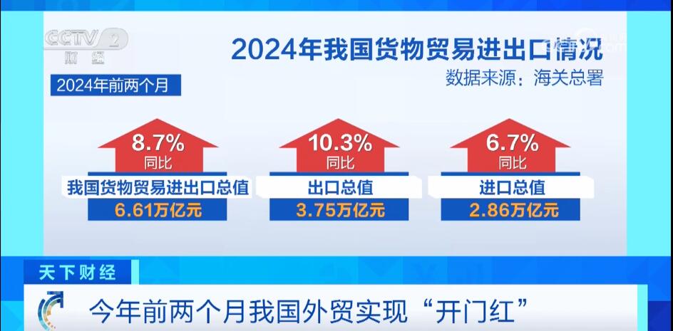 今年前2個月,我國貨物貿(mào)易進(jìn)出口總值6.61萬億元,同比增長8.7%。其中,出口3.75萬億元,同比增長10.3%;進(jìn)口2.86萬億元,同比增長6.7%。