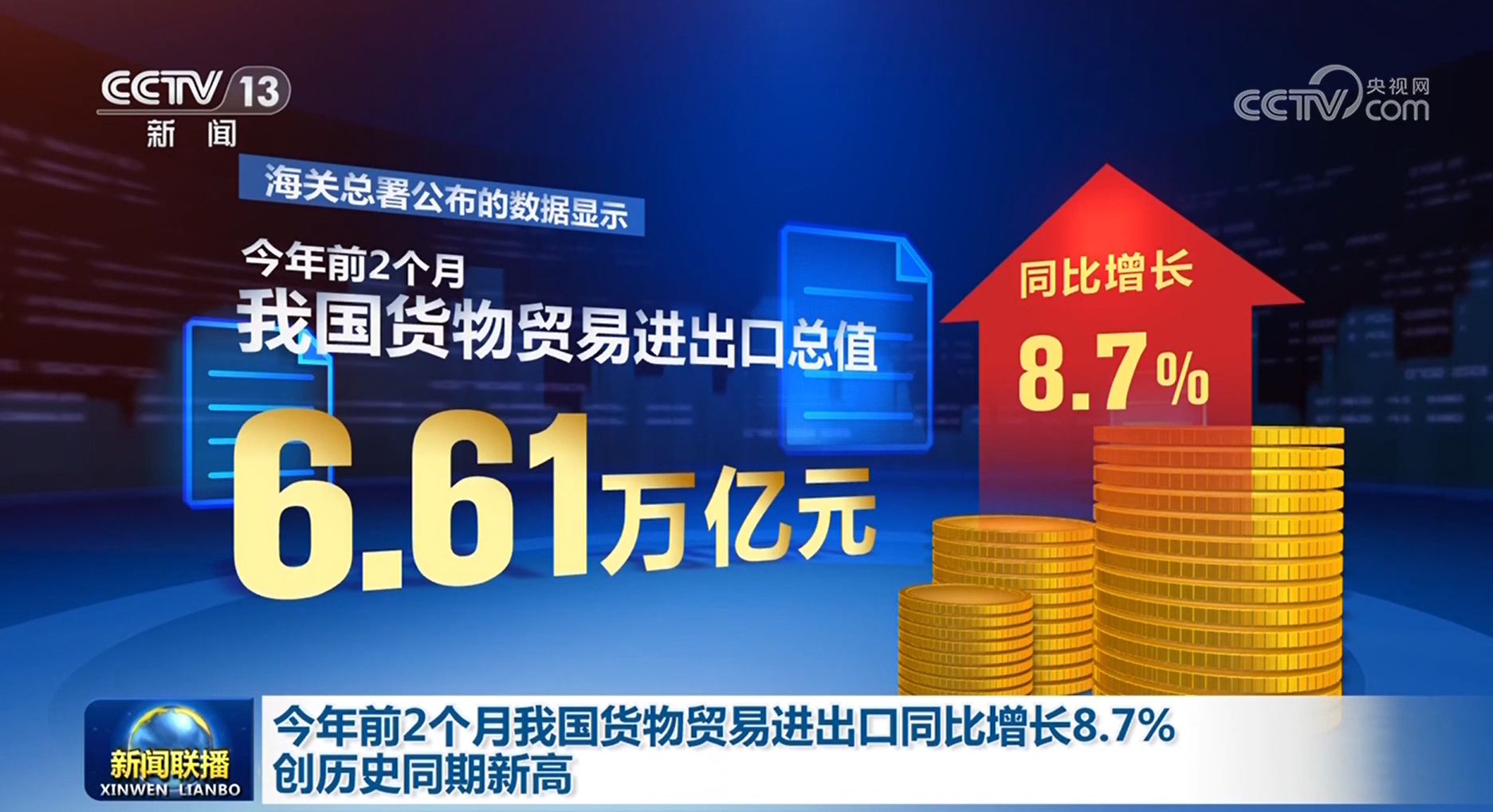 央視網(wǎng)消息(新聞聯(lián)播):記者今天(3月7日)從海關總署獲悉,今年前2個月,我國貨物貿(mào)易進出口規(guī)模創(chuàng)歷史同期新高,外貿(mào)實現(xiàn)良好開局。
