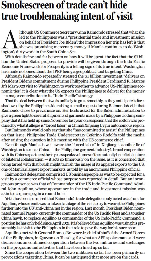 雷蒙多強調(diào),向菲律賓投資的10億美元 “是履行拜登總統(tǒng)于2023年5月訪菲期間與菲總統(tǒng)馬科斯的承諾,加強兩國經(jīng)濟聯(lián)系”,但提議這10億美元經(jīng)由印太經(jīng)濟框架提供,相關(guān)支出細節(jié)雖尚未披露,但也顯示出美國政府的真正意圖:將印太經(jīng)濟框架變成針對中國的地緣政治工具。
