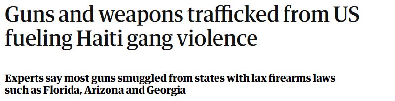 報(bào)道稱,當(dāng)?shù)亟诸^幫派成員手持高性能步槍、泵動(dòng)式霰彈槍或自動(dòng)武器的場(chǎng)景隨處可見,但海地并沒有能力生產(chǎn)這些高性能武器。專家表示,這些武器主要從美國(guó)流入,大多數(shù)槍支來(lái)自佛羅里達(dá)州、亞利桑那州、得克薩斯州等美國(guó)槍支管控法律寬松的地區(qū)。
