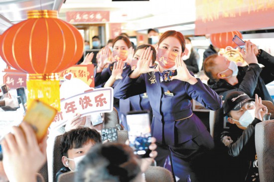 1月16日,合肥客運(yùn)段工作人員在G7162次列車上為旅客表演節(jié)目,讓旅途充滿溫情。2022年春運(yùn)從1月17日開(kāi)始,2月25日結(jié)束,共計(jì)40天。 新華社記者 黃博涵攝