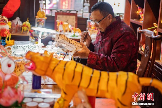 1月24日,南京秦淮花燈傳承藝人曹真榮正在趕制以“虎”為主題的花燈。隨著農(nóng)歷虎年春節(jié)的臨近,南京老城南一帶的民間花燈藝人加班加點(diǎn)趕扎花燈,迎接春節(jié)的到來。 中新社記者 泱波 攝