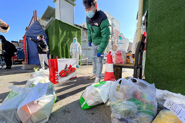 為保障居民買菜用餐等正常生活,院內(nèi)居民可以通過外賣快遞采購物資,也可以通過社區(qū)代為采購。封控區(qū)居民通過快遞外賣的購買物品,會在消殺后,由工作人員送至門口。對不會使用網(wǎng)絡(luò)購物的居民,社區(qū)提供了配餐和送貨上門服務(wù)。