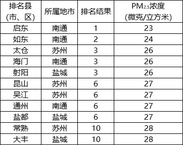 PM2.5濃度相對(duì)較好的前10位(1-10名)依次是:?jiǎn)|、如東、太倉(cāng)(海門、射陽(yáng)并列)、昆山(吳江、通州、鹽都并列)、常熟(大豐并列)。