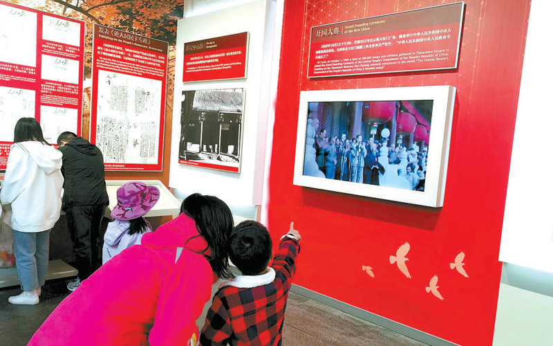 展覽當(dāng)中的一段開國大典的影像資料讓游客們紛紛駐足。“中華人民共和國中央人民政府今天成立了!”聽到錄音里毛主席的這段莊嚴宣告,游客們不由地挺直了腰桿。
