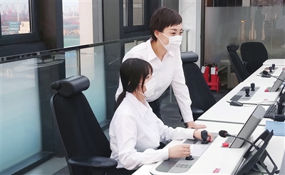在天津港集裝箱碼頭遠(yuǎn)程操控中心,軌道橋女司機(jī)丁亞楠(后)正指導(dǎo)同事遠(yuǎn)程操控。(天津港集團(tuán)供圖)