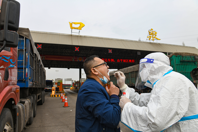高速路口,保證物資流通的同時(shí),落實(shí)防疫要求,做到應(yīng)檢盡檢,不漏一人一車(chē)。張占兵 攝