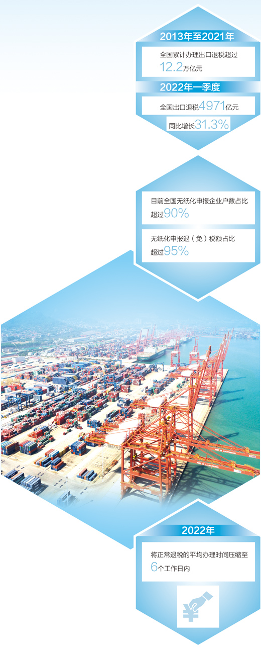 資金是企業(yè)的生命線。為助力外貿企業(yè)發(fā)展,財稅部門落實出口退稅政策,持續(xù)優(yōu)化出口退稅管理。2020年國家提高1464項產品的出口退稅率,稅務部門加強宣傳輔導、精準推送,截至2021年底,共有9.4萬戶企業(yè)因這項政策受益,累計新增退稅377億元,進一步增強了競爭力和抗壓力。2021年,國家稅務總局以出口退稅信息系統(tǒng)整合優(yōu)化為契機,大幅簡并優(yōu)化退稅申報表單資料及辦稅流程,使出口退稅管理體系業(yè)務更全面、流程更優(yōu)化、權責更清晰、運行更高效。