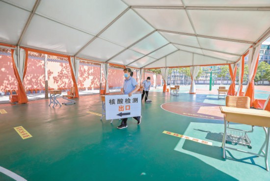 用紅色遮陽棚搭建在操場(chǎng)上的室外休息區(qū),下午考試結(jié)束后將變身核酸檢測(cè)區(qū)。 本報(bào)記者 潘之望攝