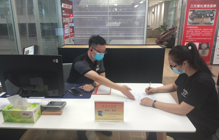 復(fù)興區(qū)澳華汽車支部黨員高賓正在為客戶服務(wù)。 連志斌攝