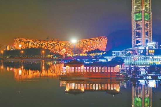 鳥巢北側(cè)的月色碼頭霓虹閃爍,濱水而建的月色碼頭已成為一處公園式消夏廣場(chǎng)。本報(bào)記者 潘之望攝