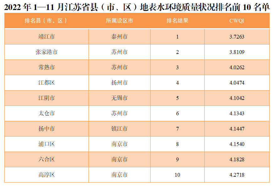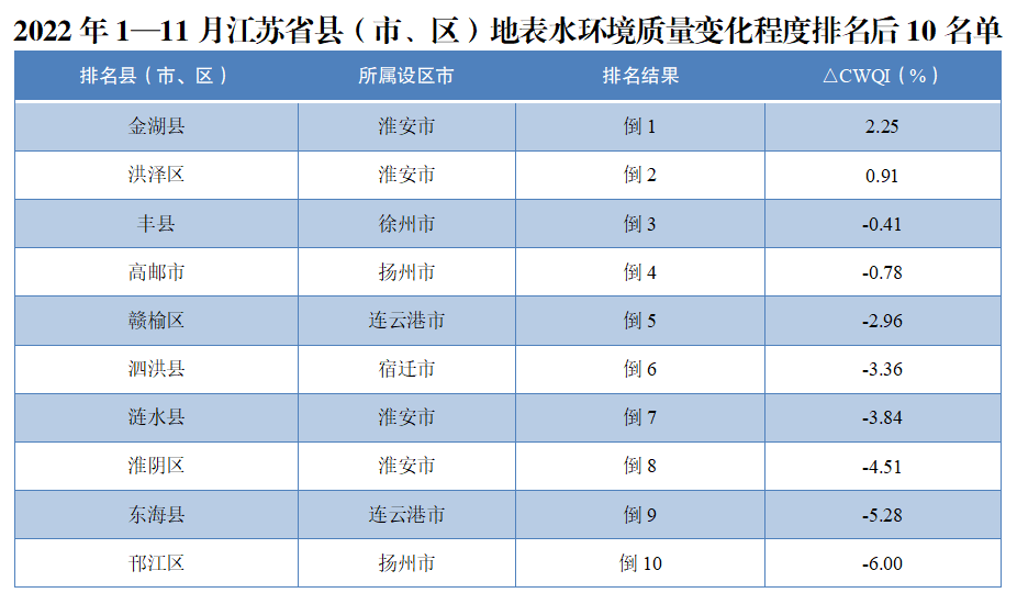具體看來(lái),2022年1—11月,63個(gè)縣(市、區(qū))中,地表水環(huán)境質(zhì)量相對(duì)較好的前10位(1—10名)依次是靖江市、張家港市、常熟市、江都區(qū)、江陰市、太倉(cāng)市、揚(yáng)中市、浦口區(qū)、六合區(qū)、高淳區(qū)。相對(duì)較差的后10位(倒1—10名)依次是銅山區(qū)、漣水縣、豐縣、泗洪縣、東海縣、贛榆區(qū)、洪澤區(qū)、沭陽(yáng)縣、金湖縣、淮陰區(qū)。