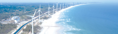 為滿足海南自貿港高質量發(fā)展電力需求,有效推進大規(guī)模新能源電力消納,海南500千伏主網架工程正在抓緊建設。圖為海南省文昌市木蘭灣沿海的風力發(fā)電機。