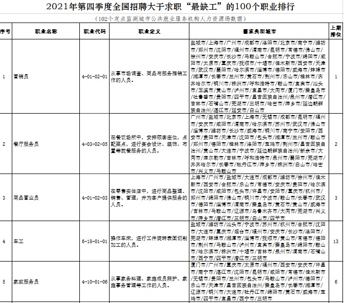 2021年第四季度全國招聘大于求職“最缺工”的100個(gè)職業(yè)排行前五位(人社部供圖)