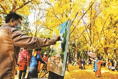 每年一進(jìn)入11月,地壇公園內(nèi)的200余株銀杏樹(shù)就被“染成”金黃色,形成“紅墻金葉”這一獨(dú)特景觀,成為京城秋日中一抹靚麗的風(fēng)景。11月1日上午,地壇公園內(nèi)“園林四季 秋之華彩”金秋銀杏活動(dòng)吸引了不少青年藝術(shù)家、廣大藝術(shù)愛(ài)好者和游園群眾參與進(jìn)來(lái)。陸愛(ài)民、李菲、賈見(jiàn)罡、李玉娥、王世高、徐佳、劉玉芬7位畫(huà)家相約而來(lái),在地壇公園內(nèi)用手中的畫(huà)筆定格美景、描繪金秋。