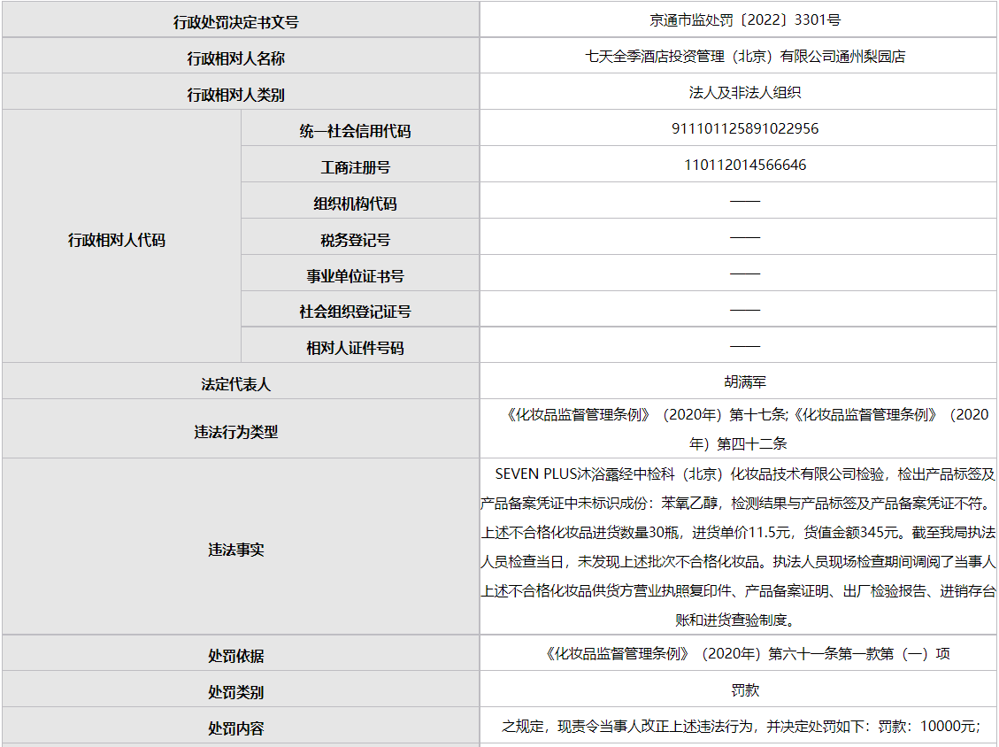 據(jù)文號為“京通市監(jiān)處罰〔2022〕3301號”行政處罰決定書顯示,七天酒店梨園店具體違法事實為:SEVEN PLUS沐浴露經(jīng)中檢科(北京)化妝品技術有限公司檢驗,檢出產(chǎn)品標簽及產(chǎn)品備案憑證中未標識成份:苯氧乙醇,檢測結果與產(chǎn)品標簽及產(chǎn)品備案憑證不符。上述不合格化妝品進貨數(shù)量30瓶,進貨單價11.5元,貨值金額345元。