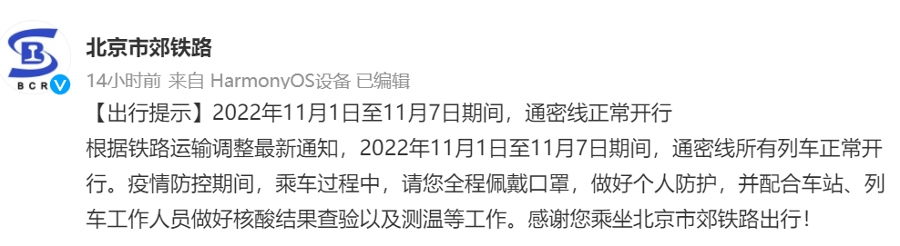 央廣網(wǎng)北京11月1日消息 據(jù)北京市郊鐵路官方微博消息,根據(jù)鐵路運輸調(diào)整最新通知,2022年11月1日至11月7日期間,通密線所有列車正常開行。