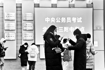 昨日早上8點,北京師范大學(xué)第三附屬中學(xué)的考點已有考生陸續(xù)到場。一些公考輔導(dǎo)機構(gòu)在考點門前派發(fā)復(fù)習(xí)資料,北京青年報記者看到,黨的二十大報告,北京冬奧會、冬殘奧會,2022年中央一號文件等時事熱點都被列為重點內(nèi)容。8點20分,考生開始入場。工作人員手持測溫儀,對每個考生進行測溫??键c內(nèi)的一樓也設(shè)置了兩個備用考場。據(jù)悉,按照要求,有發(fā)熱(體溫≥37.3℃)等可疑癥狀的,應(yīng)服從安排在備用考場佩戴N95口罩參加考試。