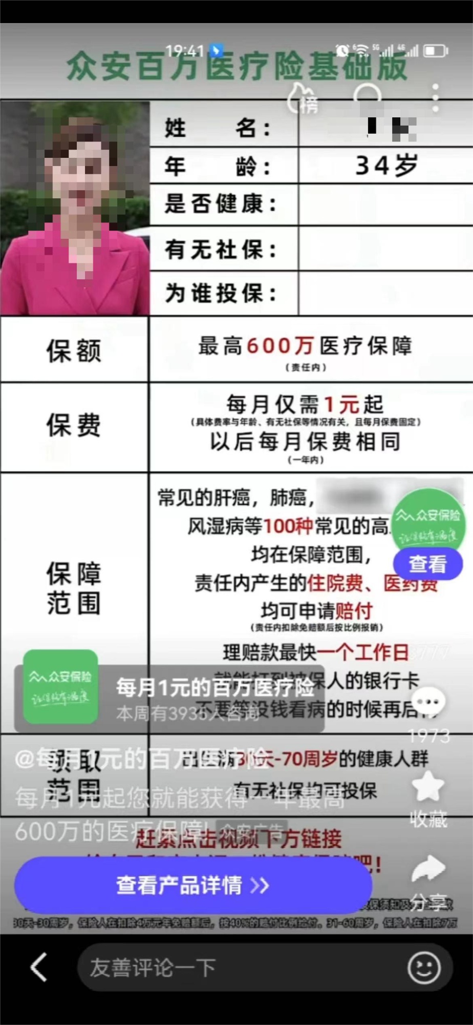 眾安保險(xiǎn)在視頻廣告上稱(chēng)每月保費(fèi)1元起(央廣網(wǎng)發(fā) 記者截圖)