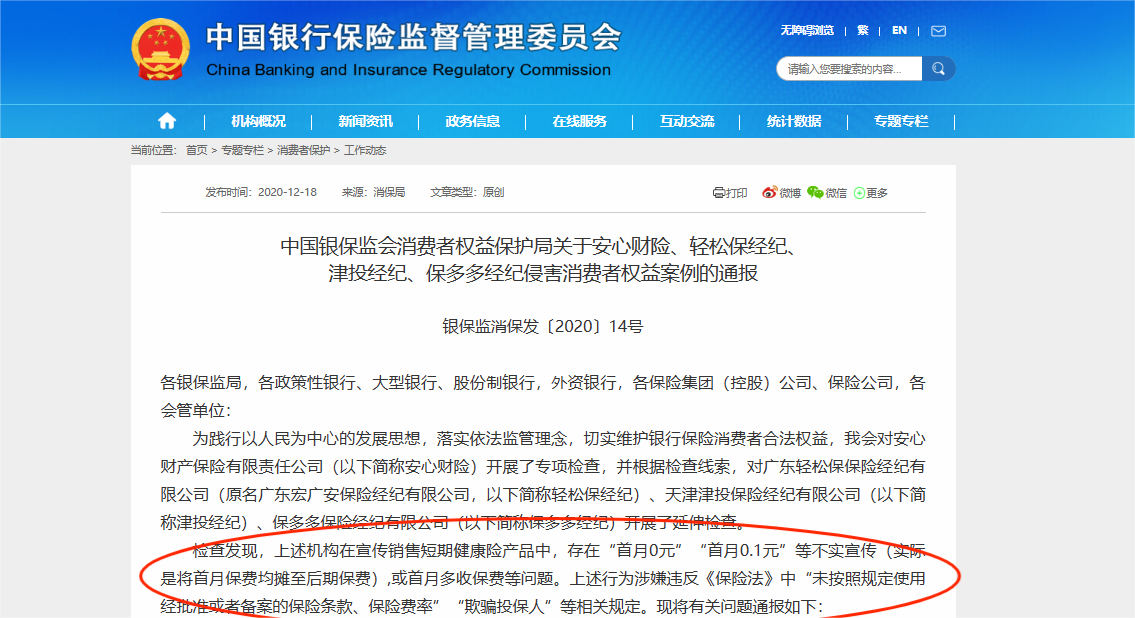 2020年,中國(guó)銀保監(jiān)會(huì)消費(fèi)者權(quán)益保護(hù)局發(fā)布關(guān)于安心財(cái)險(xiǎn)、輕松保經(jīng)紀(jì)、津投經(jīng)紀(jì)、保多多經(jīng)紀(jì)侵害消費(fèi)者權(quán)益案例的通報(bào)。通報(bào)稱(chēng)檢查發(fā)現(xiàn),上述機(jī)構(gòu)在宣傳銷(xiāo)售短期健康險(xiǎn)產(chǎn)品中,存在“首月0元”“首月0.1元”等不實(shí)宣傳(實(shí)際是將首月保費(fèi)均攤至后期保費(fèi)),或首月多收保費(fèi)等問(wèn)題。上述行為涉嫌違反保險(xiǎn)法中“未按照規(guī)定使用經(jīng)批準(zhǔn)或者備案的保險(xiǎn)條款、保險(xiǎn)費(fèi)率”“欺騙投保人”等相關(guān)規(guī)定。