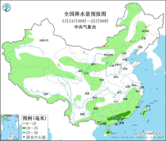 5月24日08時(shí)至25日08時(shí),內(nèi)蒙古中東部、東北地區(qū)西部、新疆伊犁河谷和南部、西北地區(qū)中東部、華北北部、江南東部和南部、西南地區(qū)東部、華南、臺(tái)灣島等地部分地區(qū)有小到中雨,其中,廣東中南部等地局地有大雨(25~40毫米)。內(nèi)蒙古、東北地區(qū)、華北東部、黃淮東部等地部分地區(qū)有4~6級(jí)風(fēng),其中,內(nèi)蒙古西部部分地區(qū)有6~7級(jí)風(fēng)。