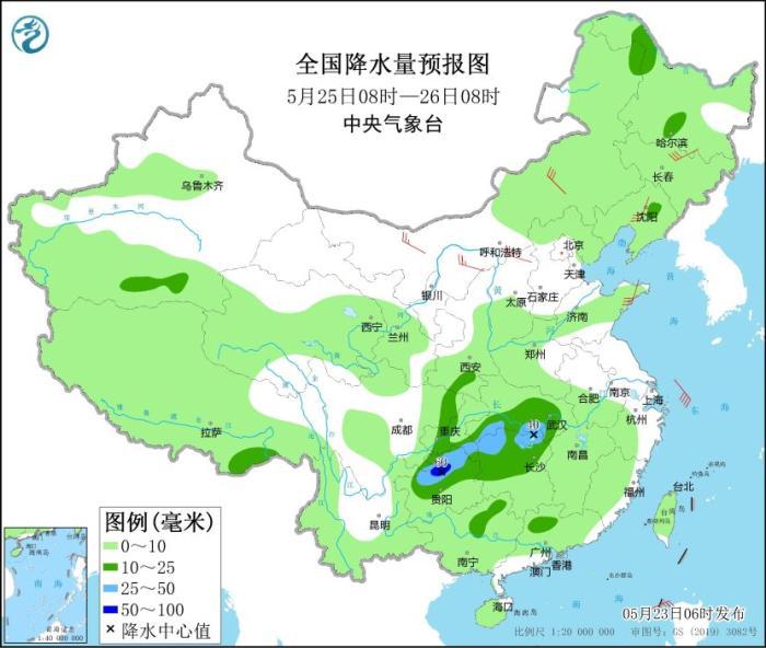 5月25日08時(shí)至26日08時(shí),內(nèi)蒙古東北部、黑龍江南部、遼寧中北部、江漢、江南北部、西南地區(qū)東部、廣西東北部等地部分地區(qū)有中到大雨,其中,貴州北部等地部分地區(qū)有暴雨(50~60毫米)。內(nèi)蒙古、東北地區(qū)、山東半島等地的部分地區(qū)有4~6級(jí)風(fēng)。