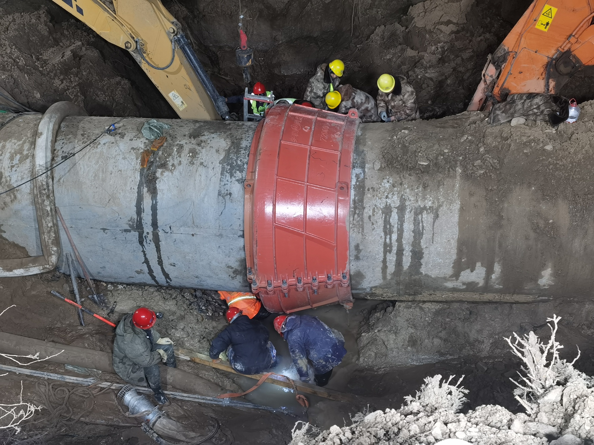 張文偉說:“因為這個管道是個兩米直徑的供水管線,是個主管線,它破裂以后水量特別大。管線是在耕地上,維修車輛是進不去的。維修首先得修筑施工通道,所有車輛人員靠近不了,然后關閘停水,走施工通道過去以后,進行原有管道抽排,管道里都是滿水,必須把水排干凈才能搶修,才能發(fā)現它是哪兒壞了,我們采取哪種方式來進行搶修。搶修方案有很多種,我們也提前都有預案。所以抽水時間很長,上游就有7萬多立方的水,抽排就是一個很大的難點?!?/p>