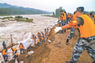 7月19日,空降兵某旅官兵到達受災現(xiàn)場后,迅速向堤壩塌陷處運送沙袋。謝程宇 攝