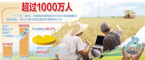“十三五”期間,全國每年都有超過1000萬名貧困群眾擺脫貧困,脫貧進度符合預期。到2019年年底,貧困發(fā)生率降至0.6%。目前,國家正對52個未摘帽貧困縣和1113個貧困村實施掛牌督戰(zhàn),凝心聚力堅決啃下最后的硬骨頭。