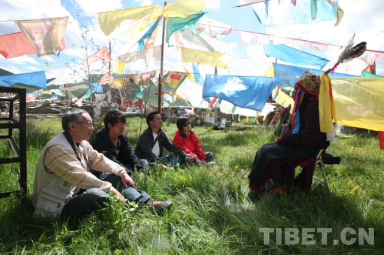 2010年,正當(dāng)我準備前往西藏自治區(qū)林芝市墨脫縣采訪之際,嘉銘先生一個電話使我的西藏行改為了甘孜金馬草原行?!皭勖髦骶?,聽說甘孜州色達縣有好幾個‘格薩爾’藝人,一個伏藏,一個從石頭里說唱的女藝人!”他在電話里興奮得發(fā)出從未有過的高聲?!皝戆?!我陪你,我們一起去!”征得社長同意,我立刻飛赴成都,坐上他早已聯(lián)絡(luò)安排好的越野車,直接趕往色達縣。沿途滿目都是兩年前大地震的痕跡遺留,觸目驚心,加上早些天的暴雨泥石流,到處都是落石,所幸我們時時安好。