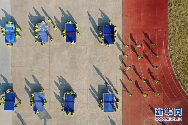 11月12日,學(xué)生在大課間打乒乓球(無人機照片)。 位于山東省青島市即墨區(qū)的青島藍(lán)谷高新區(qū)東皋埠小學(xué)是一所鄉(xiāng)村學(xué)校,近年來,學(xué)校開展以乒乓球、籃球、跳繩等運動為主的大課間活動,讓孩子們在享受運動的同時愉悅身心,增強體質(zhì)。 新華社發(fā)(梁孝鵬攝)