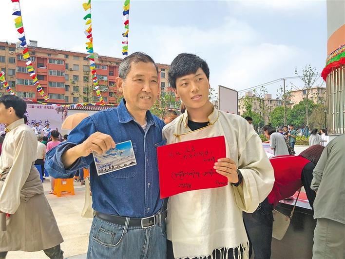 圖為江蘇省南通中學(xué)藏文化社團(tuán)在南通市北濠社區(qū)開展藏文化宣傳與展示活動時(shí),藏族學(xué)生把藏文書寫的明信片贈送給當(dāng)?shù)厥忻瘛?圖片由江蘇省南通中學(xué)提供