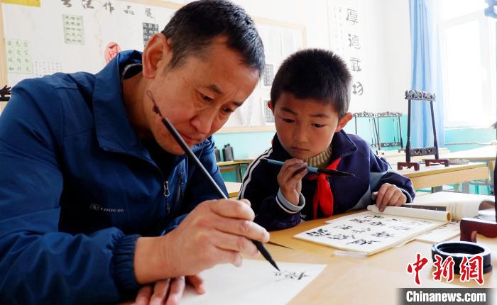 圖為青海省門源縣仙米鄉(xiāng)寄宿制小學(xué)少年宮學(xué)生在老師指導(dǎo)下寫毛筆字。(資料圖) 李雋 攝