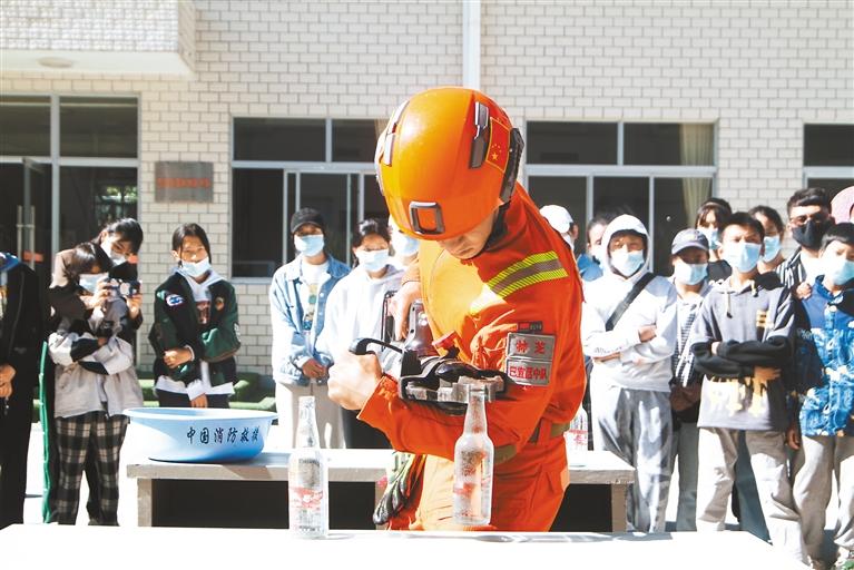 消防員就裝備正確使用方法進(jìn)行演示。通訊員 徐嘉陽(yáng) 記者 謝筱純 王珊 張猛 攝