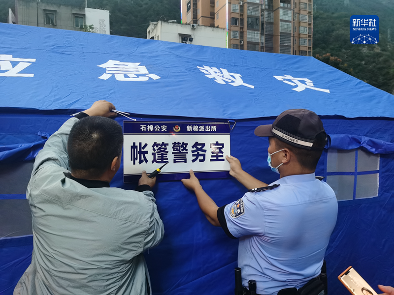 9月5日,邱建華(右一)在石棉縣受災群眾安置點搭建帳篷警務室。(圖片由石棉縣公安局提供)