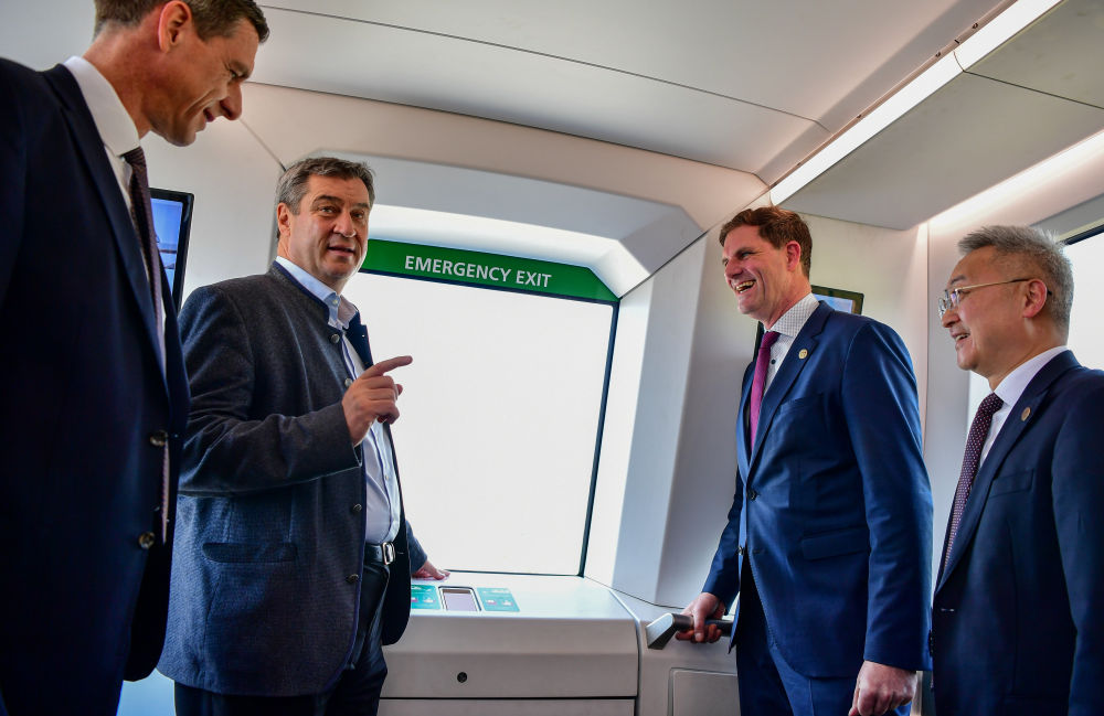 德國巴伐利亞州州長索德爾(左二)一行體驗中德合作的磁懸浮成都試驗線。新華社記者張超群攝