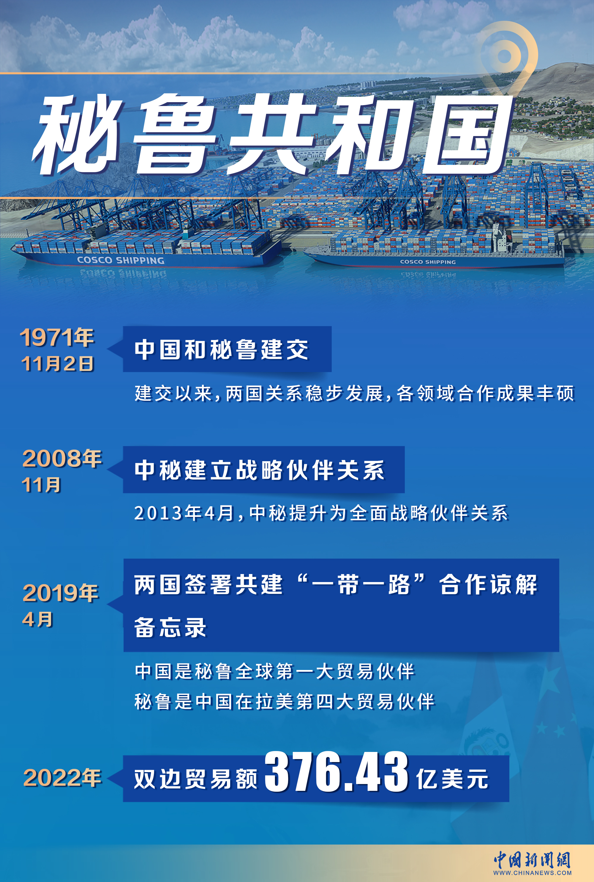 2022年,中秘雙邊貿(mào)易額達(dá)376.43億美元,目前,中國(guó)是秘魯全球第一大貿(mào)易伙伴、第一大出口市場(chǎng)和第一大進(jìn)口來(lái)源國(guó),秘魯也是中國(guó)在拉美第四大貿(mào)易伙伴。